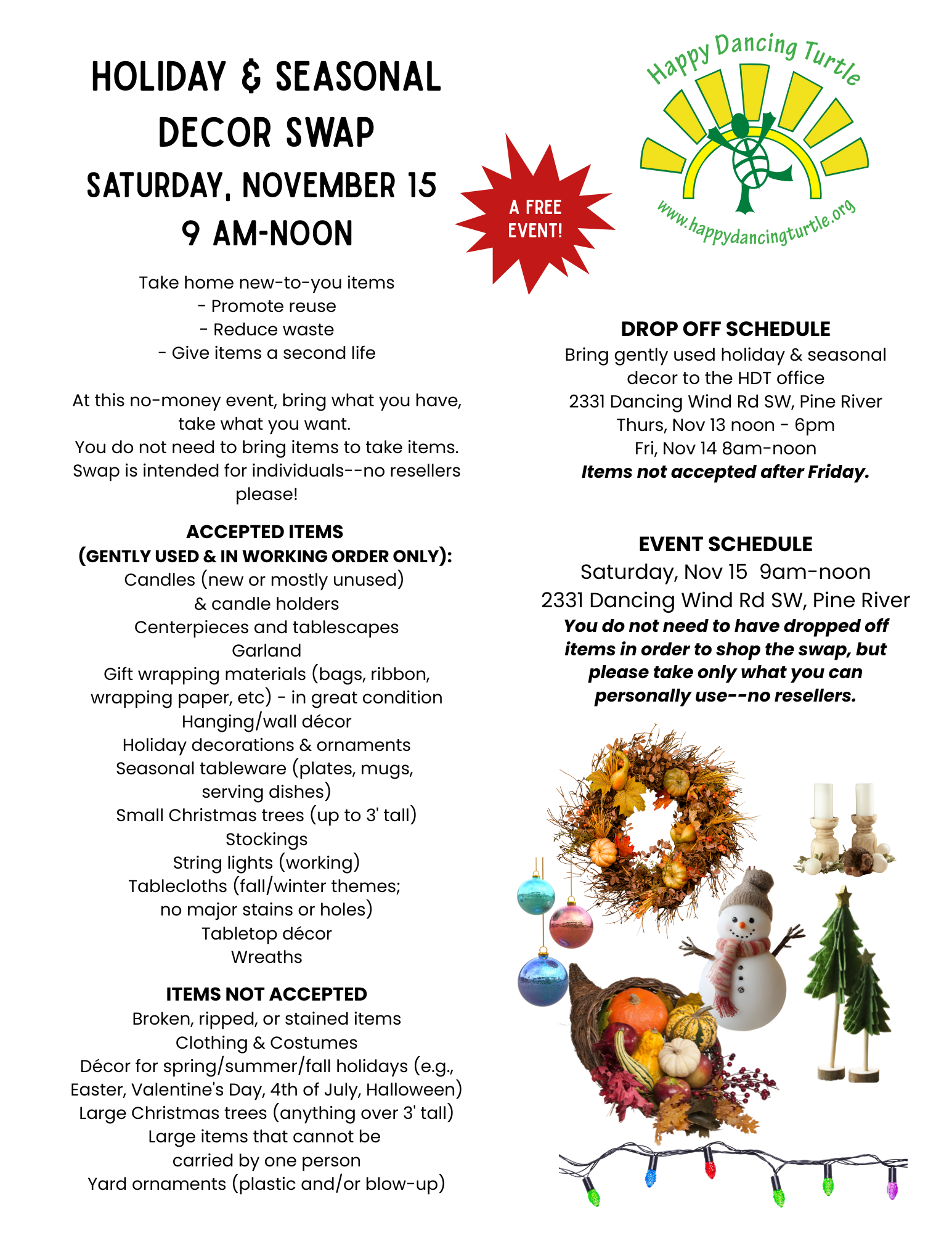 Bring gently used holiday & seasonal decor to the HDT office 2331 Dancing Wind Rd SW, Pine River Thurs, Nov 13 noon - 6pm Fri, Nov 14 8am-noon Items not accepted after Friday.