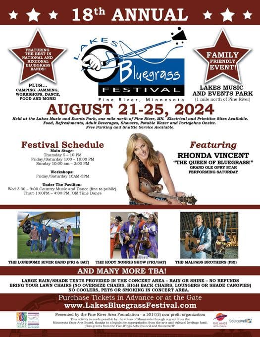 The Lakes Bluegrass Festival presents nationally known, regional, and local bluegrass bands. This event has professional main stage entertainment, jam sessions, dancing, hands-on work shows and more. This event is hosted and sponsored by the Pine River Area Foundation which is a 501(c)3 non-profit organization.
